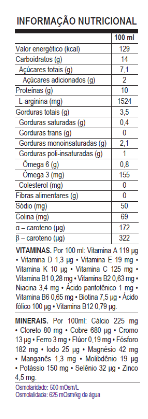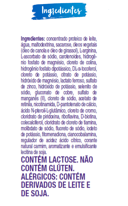 Descrição: Fórmula modificada para nutrição enteral ou oral, desenvolvida especificamente para a cicatrização de lesão por pressão (LPP) e outras situações que exijam estímulo da cicatrização. Fórmula hiperproteica, acrescida de arginina e com alto teor de micronutrientes relacionados à cicatrização (zinco, selênio, vitamina C, A e E), além de presença do exclusivo mix de carotenóides.