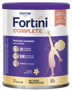 Fortini Complete é uma fórmula pediátrica, em pó, completa e balanceada, normocalórica (1,0Kcal/ml), indicado para crianças de 3 a 10 anos. Com alto teor de vitaminas e minerais, contém Ômega 3 (DHA + EPA), fibras (GOS e FOS) que auxiliam no funcionamento intestinal e não tem adição de sacarose. Não contém glúten.