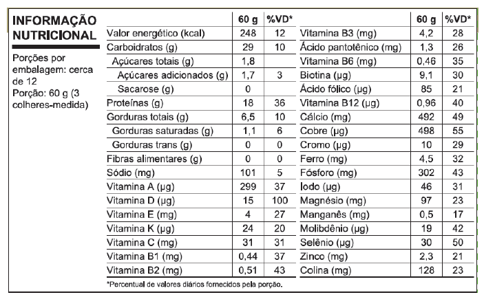 O produto também contém alto teor de proteínas, de vitaminas D e cálcio, vitamina C, Zinco e vitamina B12.