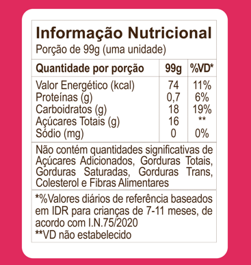 Feita com uma mistura de frutas cuidadosamente selecionadas, essa papinha é rica em fibras, vitaminas e antioxidantes, contribuindo para o fortalecimento do sistema imunológico e o bom funcionamento do intestino.