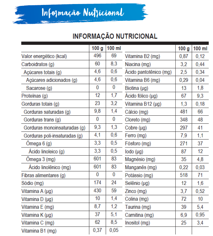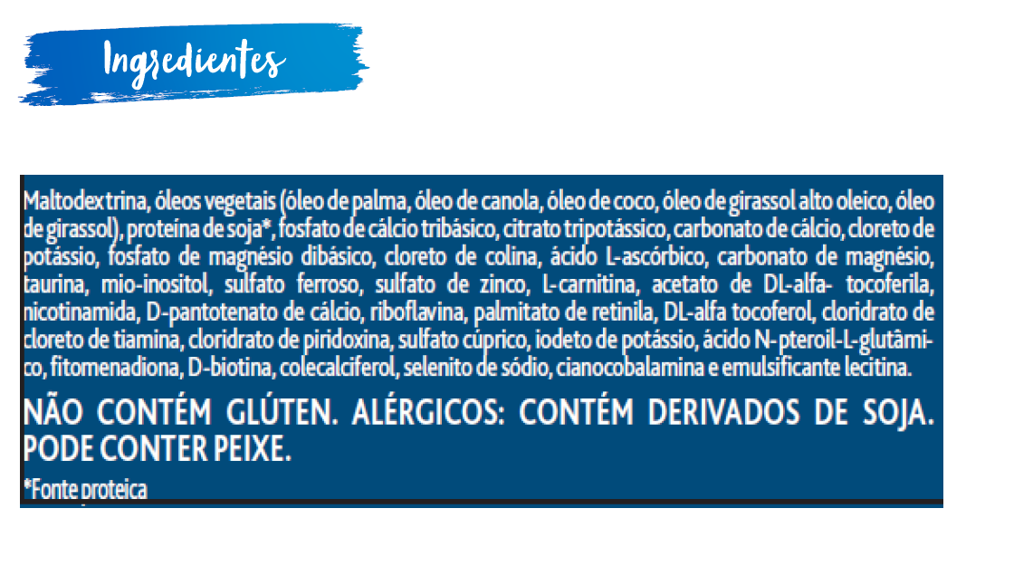 Descrição: Fórmula infantil de seguimento em pó, a base de proteína de soja. Contém ácidos graxos essenciais - ácido linoleico (ômega 6) e ácido alfa-linolênico (ômega 3). Não contém proteínas lácteas.