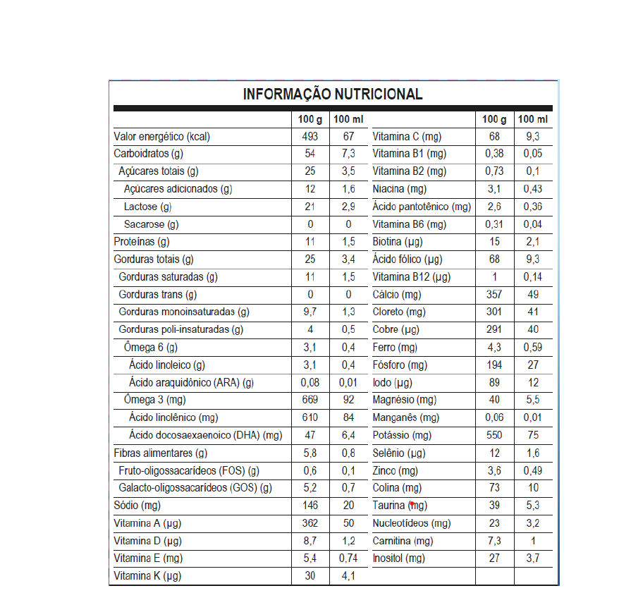 - Possui prebióticos GOS (Galactooligossacáridos), FOS (Frutooligossacáridos) e nucleotídeos;