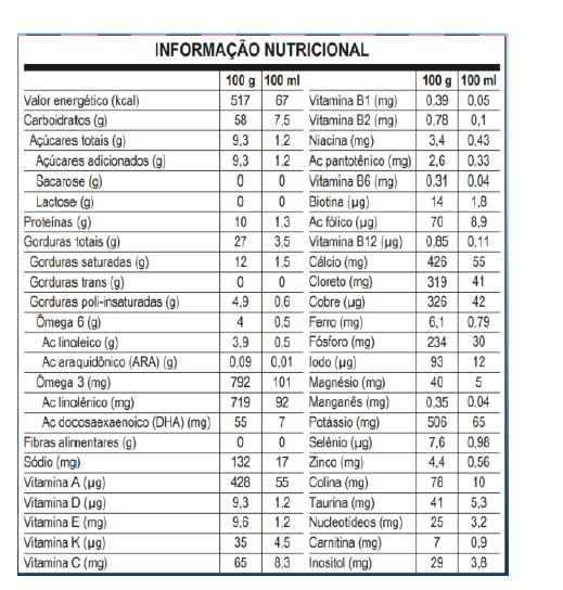 Importante: o uso deste produto em crianças menores de 1 (um) ano deve ser indicado por orientação de um Médico e/ou Nutricionista. O aleitamento materno é essencial para a saúde do bebê, evitando infecções e alergias, além de fortalecer o vínculo entre mãe e filho.