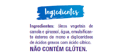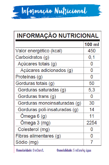 Descrição: Fórmula de emulsão lipídica, composta por triglicérides de cadeia longa (canola e girassol de alto teor oleico). Fonte energética com elevada densidade calórica pronta para uso oral ou enteral (4,5kcal/ml). Apresenta o seguinte perfil lipídico: monoinsaturados (60,7% do VET), poli-insaturados (28,6% do VET) e saturados (10,7% do VET); isento de vitaminas, minerais e proteínas.