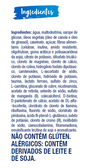 Descrição: Suplemento alimentar nutricionalmente completo para crianças, hipercalórico, fornecendo alto aporte de nutrientes em pequeno volume. Contém excelente perfil lipídico, é rico em vitaminas e minerais. Enriquecido com mix de carotenoides e com exclusivo mix multi fiber, com 60% de fibras solúveis e 40% de fibras insolúveis. Isento de corantes.