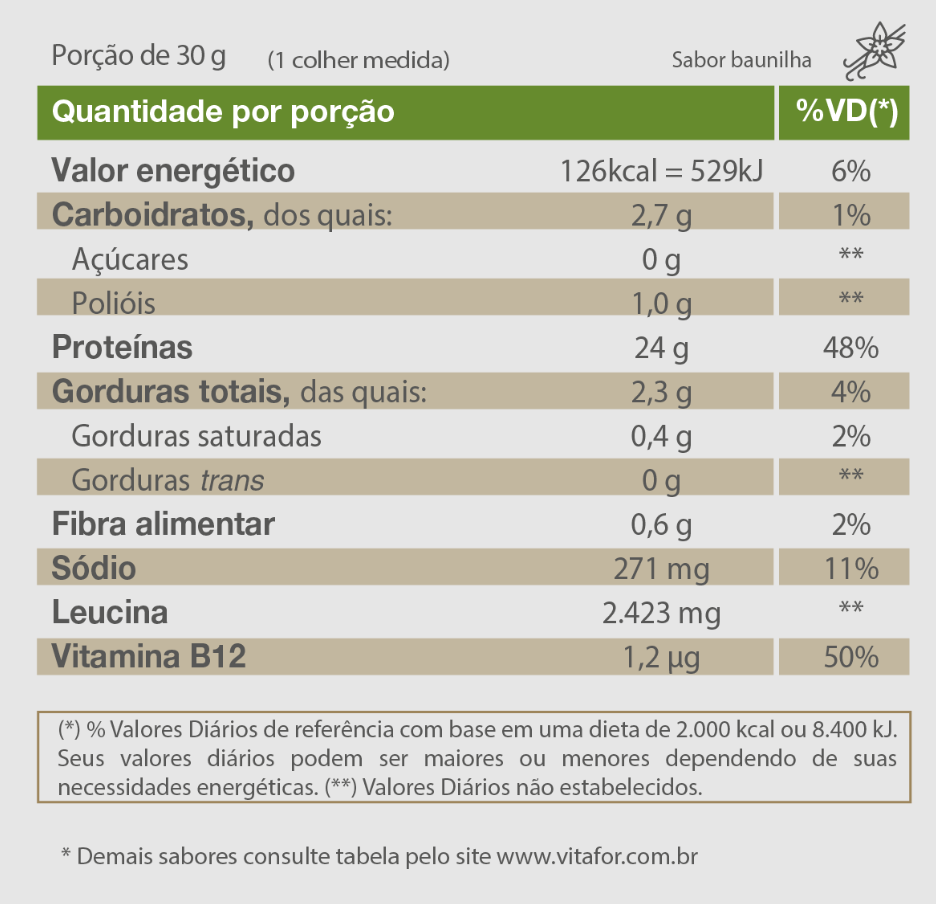 Composição: Blend de proteínas vegetais: proteína isolada de ervilha e proteína de arroz; 80% de concentração proteica (24 g) por porção; Com adição de L-leucina (2.423 mg) por porção; 4,1 g de BCAA por porção; Com adição de vitamina B12 de origem vegetal.