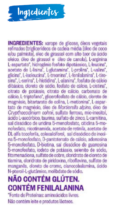 Descrição: Fórmula infantil elementar para lactentes e de seguimento para lactentes e crianças de primeira infância para necessidades dietoterápicas específicas, nutricionalmente completa e isenta de proteína láctea, lactose, sacarose, frutose, galactose e ingredientes de origem animal. Contém aminoácidos livres e sintéticos, xarope de glicose, óleos vegetais e TCM. Adicionada de LCPufas (ARA e DHA) e nucleotídeos. Atendendo a todas as legislações pertinentes.