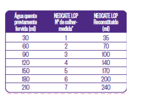 Diluição: Adicionar 1 colher-medida rasa de pó para cada 30ml de água quente previamente fervida.