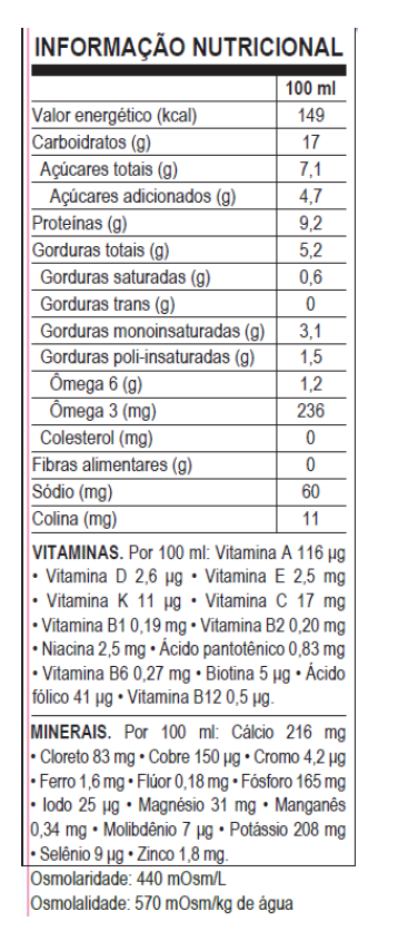 Descrição: Fórmula modificada para nutrição enteral ou oral, com densidade energética alta e hiperproteico, com aporte de proteínas de alto valor biológico. Rico em vitaminas e minerais e com excelente perfil lipídico.