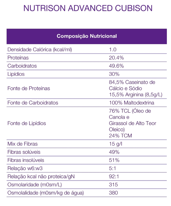 Indicado para nutrição enteral, Nutrison Advanced Cubison possui fórmula normocalórica e hiperprotéica, suplementada com arginina e nutrientes que favorecem a cicatrização.