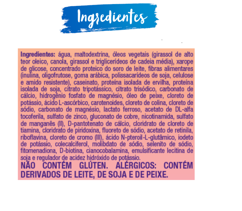 Descrição: Fórmula modificada para nutrição enteral, nutricionalmente completa, hipercalórica, com adequado teor proteico. Contém mistura proteica, com proteínas animais e vegetais, enriquecida com mix de carotenóides. Contém mistura de lipídios, fornecendo os ácidos graxos ômega 3 - DHA e EPA. Desenhada em conformidade com as mais recentes recomendações científicas, visando melhor tolerância gastrointestinal. Enriquecida com o exclusivo MF6, com 80% de fibras solúveis e 20% de fibras insolúveis.