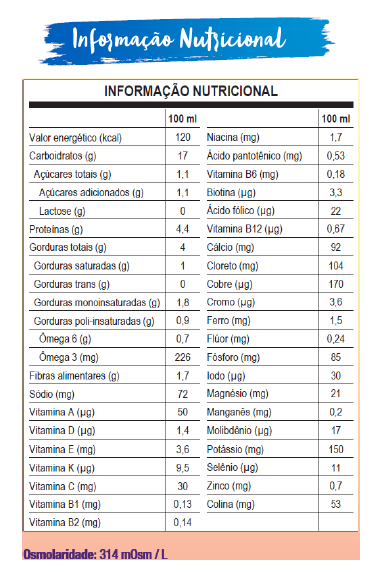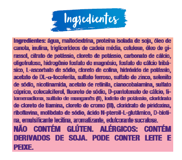 Ingredientes: água, maltodextrina, proteína isolada de soja, óleo de canola, fibras alimentares (inulina, celulose, oligogrutose), triglicerídeos de cadeia média, óleo de girassol, carbonato de cálcio, cloreto de potássio, difosfato tricálcico, fosfato de magnésio, citrato de potássio, cloreto de colina, hidróxido de potássio, L-ascorbato de sódio, acetato de DL-a-tocoferila, fluoreto de sódio, sulfato ferroso, sulfato de zinco, nicotinamida, D-pantotenato de cálcio, acetato de retinila, colecalciferol, sulfato de manganês (II), cloridrato de tiamina, cloridrato de piridoxina, sulfato de cobre, fitomenadiona, selenito de sódio, iodeto de potássio, riboflavina, D-biotina, cianocobalamina, cloreto de cromo (III), ácido N-pteroil-L-glutâmico, molibdato de sódio, aromatizante, edulcorante sucralose.