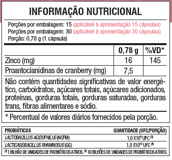 Ingredientes: Cranberry em pó (Vaccinium macrocarpon Aiton), bisglicinato de zinco (zinco), Lacticaseibacillus rhamnosus GG (ATCC 53103) e Lactobacillus acidophilus NCFM (ATCC SD5221), agente de massa celulose microcristalina, antiumectante dióxido de silício e lubrificante estearato de magnésio. Composição da cápsula: hidroxipropilmetilcelulose (HPMC), água purificada, opacificador (corante carbonato de cálcio e amido modificado), gelificante carragena e regulador de acidez acetato de potássio.