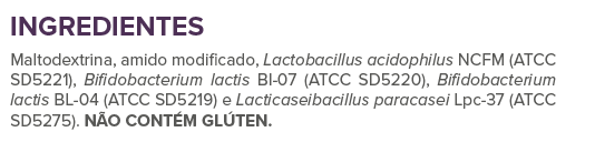 Composição: Possui quatro cepas probióticas: Bifidobacterium lactis BI-07 (ATCC SD5220), Lactobacillus acidophilus NCFM (ATCC SD5221), Bifidobacterium lactis BI-04 (ATCC SD5219) e Lacticaseibacillus paracasei Lpc-37 (ATCC SD5275).