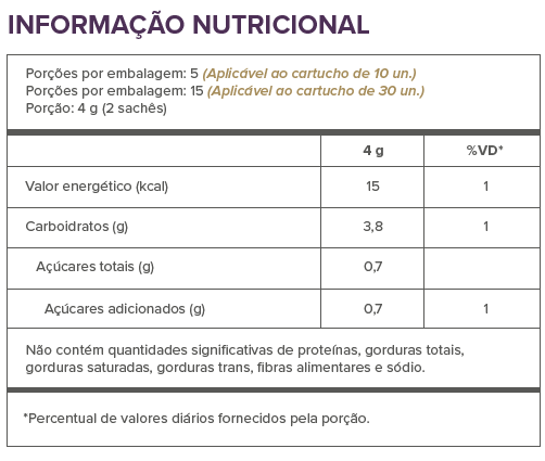 Informações adicionais: Manter o produto bem fechado e conservar ao abrigo de luz, calor, odor e umidade. Armazenar em temperatura climatizada, máximo 25ºC. Não utilize o produto caso a embalagem esteja violada. Após aberto, consumir preferencialmente em até 60 dias.