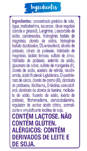 Descrição: Fórmula modificada para nutrição enteral ou oral, desenvolvida especificamente para a cicatrização de lesão por pressão (LPP) e outras situações que exijam estímulo da cicatrização. Fórmula hiperproteica, acrescida de arginina e com alto teor de micronutrientes relacionados à cicatrização (zinco, selênio, vitamina C, A e E), além de presença do exclusivo mix de carotenóides.