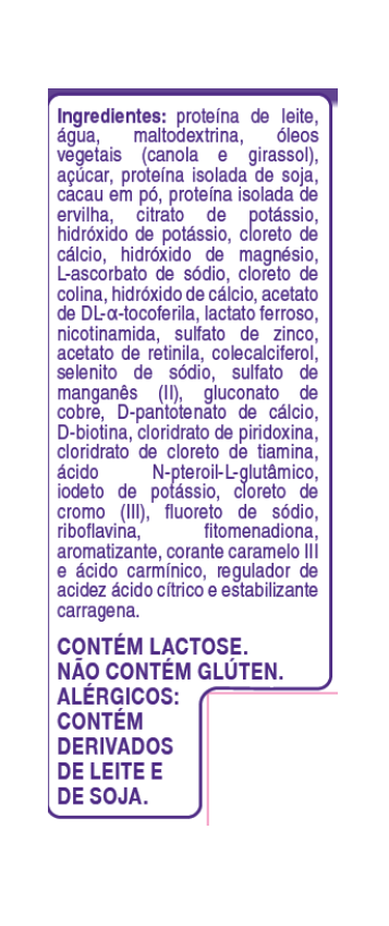 Descrição: Fórmula modificada para nutrição enteral ou oral, com densidade energética alta e hiperproteico, com aporte de proteínas de alto valor biológico. Rico em vitaminas e minerais e com excelente perfil lipídico.