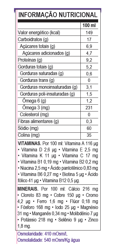 Pode ser utilizado na nutrição enteral ou na suplementação oral. Apresenta densidade energética alta (1,5 kcal/ml), é hiperproteico e com aporte de proteínas de alto valor biológico. Também é rico em vitaminas e minerais e com excelente perfil lipídico.